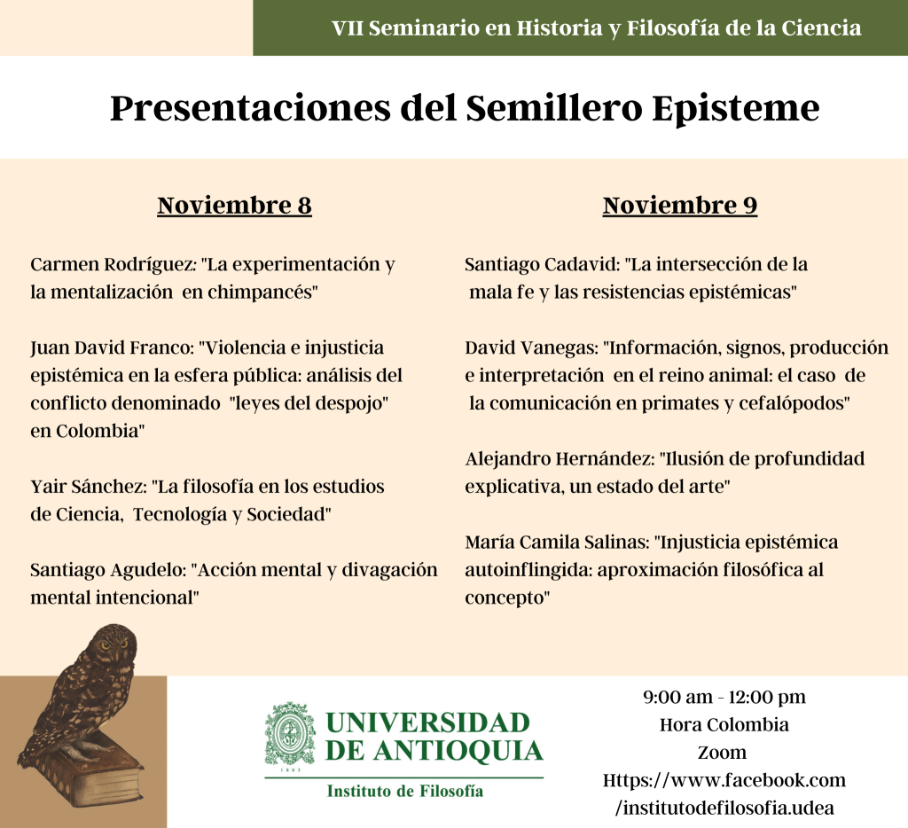 El Instituto de Filosofía de la Universidad de Antioquia invita cordialmente a la comunidad académica a las presentaciones del semillero Episteme. Este será el evento de clausura del «VII Seminario en Historia y Filosofía de la Ciencia: Wittgenstein 100 años después del Tractatus». Las presentaciones se llevarán a cabo los días 8 y 9 de noviembre, de 9:00 am a 12:00 pm.